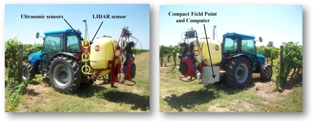 Canopy characteristics can be measured manually. In this case simple values of averaged crop height and crop width are easily measured and from those values, estimations of canopy volume can be obtained. This parameter has been widely used by different authors [13–15] to establish application rates, but those manual measurements assume a homogeneous crop structure over the entire field and extrapolate measurements from several points on a crop line to the whole area. Total leaf surface and leaf area index (LAI) can be also manually measured. This involves a destructive, time consuming and expensive method including the total defoliation of a sample crop area and extended laboratory measurements of every individual leaf surface. Also in this case the obtained values in selected sampling area must be extended to the whole canopy area without consideration of any “in row” variability.