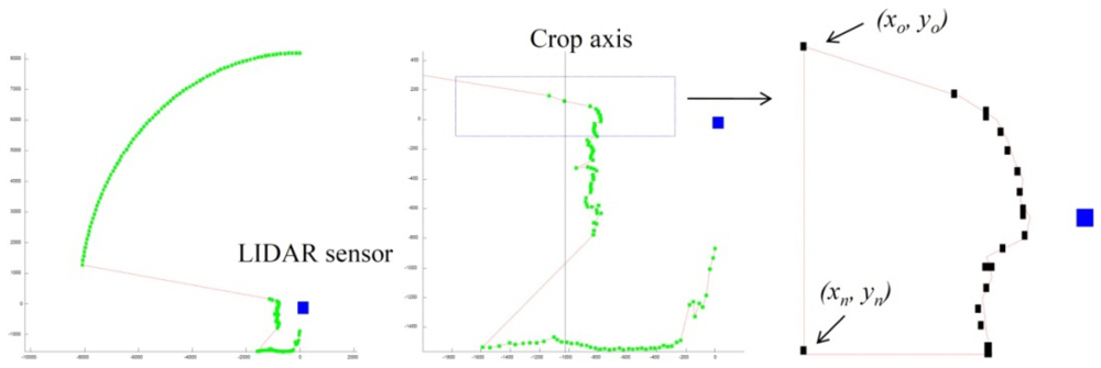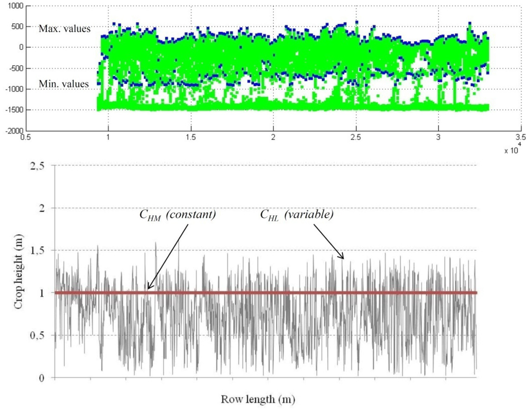The same driving tracks along the row crop at a constant forward speed used for ultrasonic sensor measurements were used for LIDAR canopy characterization (Figure 4). Data was also stored in the on board computer in the form of polar coordinates (each point of the crop canopy was characterized by the distance and angle referred to 0° of the position of the laser sensor). Data processing was performed using LidarScann v.1®, a specific software created for management data for the SICK LSM 200 laser sensor. Furthermore, a graphic user interface was developed in MatLab (The Mathworks Inc, Natick, MA, USA) for off-line processing and algorithm development. Figure 5 shows the procedure applied to data obtained with the LIDAR sensor to determine canopy characteristics. Crop profile was first generated with all the points where the laser intercepted any leaf layout (left). Once the crop profile was obtained (centre) the average crop width measured with LIDAR, CWL (m) was calculated by the average distance of every single point to the center of the crop line. Crop height, CHL (m) was also measured with LIDAR by calculating the difference between Yi coordinates from maximum and minimum measured points on every measured range.