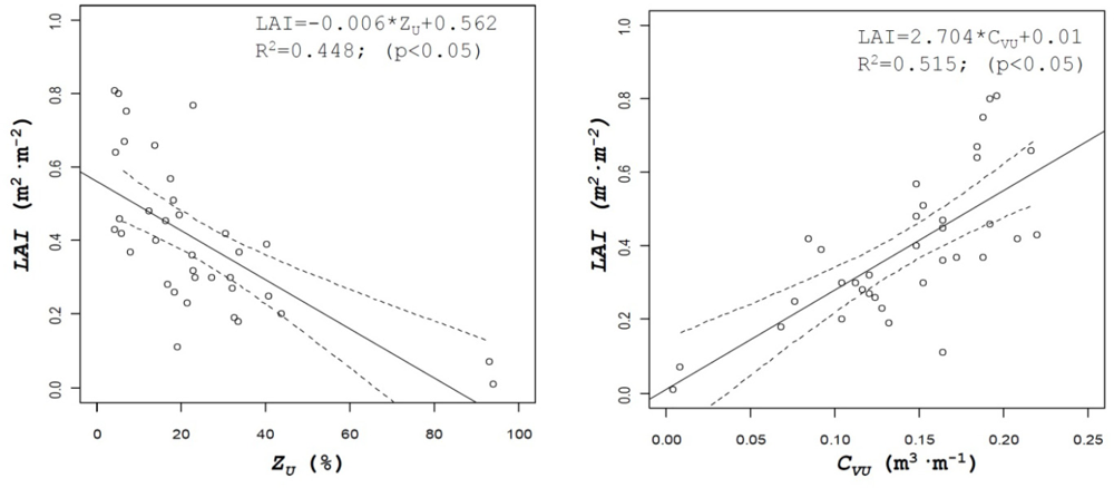 Table 2 lists the coefficients of determination of all the parameters evaluated. Those parameters included not only the above described and most important canopy structure characteristics but others, either obtained from manual measurements on the field such as leaf area index (LAI) or numerical values derived from the use of the sensors, such as percent of zero values measured on the crop with ultrasonic or LIDAR sensors, ZU and ZL, respectively, or IL (impacts·m−1) defined as the number of impacts (points were laser beam detected canopy). A good example of those relationships is shown on Figure 7, where important crop characteristics such as leaf area index of crop volume can be predicted from the number of impacts obtained with LIDAR in the canopy or from the values of canopy height measured with the same sensor, respectively.