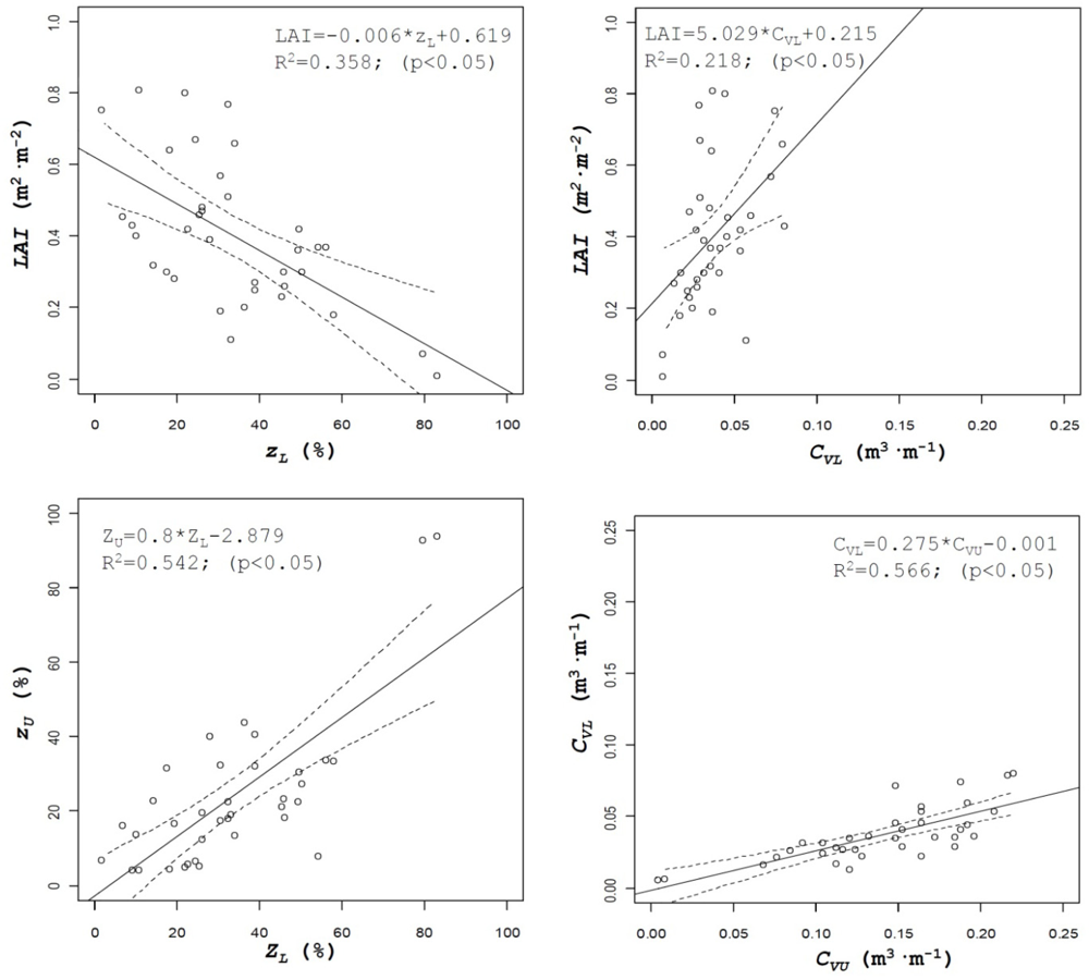 A detailed analysis of the correlation coefficients (Table 2) of all these parameters gives precise information about which variables can be predicted by others, always with the main goal of an easy and quick canopy characterization. A selection of those relationships was made according the following criteria: (a) interesting relationships between canopy parameters and values measured electronically; (b) rational relationship between variables; and (c) variables whose coefficients of determination indicate an expected good tendency.