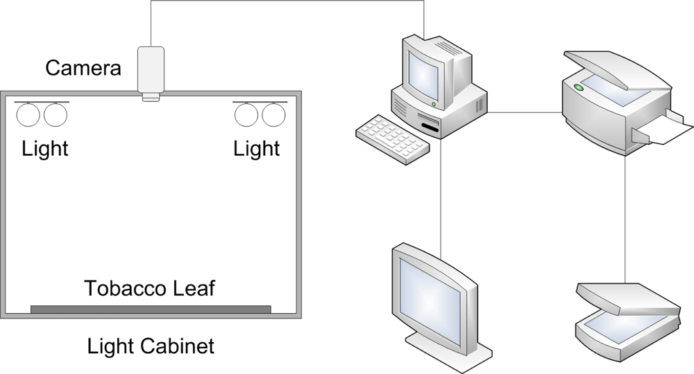 LED lights are fixed on the top of the cabinet. Tobacco leaf is placed on a piece of white board that could slide into the cabinet. The digital color image of tobacco leaf is obtained by the color camera and sent to computer, in which it is saved as a pixel matrix. The images is composed of three sets of pixels for each color. The image’s size is 512 × 512. Other equipments include a printer and a scanner. Delphi programming language is used to implement all algorithms.