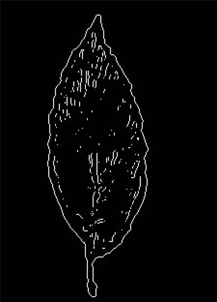 24-bit color image of tobacco leaves are transformed to binary image. After Laplacian of Gaussian filtering, a closed and connected contour is obtained when interior points are eliminated. Edge detection of a tobacco leaf using Laplacian of Gaussian filtering is shown in Figure 3.