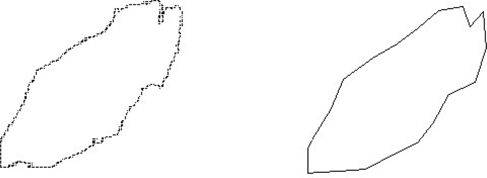 The polygonal fitting is implemented to the edge curve when we get the edge data of the tobacco leaf. The aim of polygonal fitting is to substitute the smooth tobacco leaf edge to a polygonal edge. The polygonal fitting of edge of the tobacco leaf is shown in Figure 4. The vertexes in polygon is connected and formed some triangle. The sum number of pixels in each side of the fitted polygon is the approximate perimeter of the tobacco leaf. The hight, width and area of tobacco leaf can be calculated from the triangled polygon. The surface area of the fitted polygon is the approximate surface area of the tobacco leaf. We record the number of all the interior pixels of the fitted polygon, and record the number of all the interior pixels which color is same as the color of the background color. The ratio of two kinds of pixels is the disfigurement of the tobacco leaf.