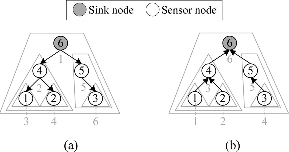 There are some other similar works that focus on the data transmission time scheduling in convergecast. They can be divided into two categories: (1) works that aim to minimize the convergecast time or energy cost [8–14]. These methods only realize collision-free transmission in the case that each node generates the same amount of data at the same rate; (2) works that aim to maximize data aggregation efficiency. Some of them [15,16] employ the similar idea as that in DMAC, thus they also suffer from collisions. Some researchers have tried to avoid collisions in data aggregation [17–19], however, these TDMA scheduling approaches restrict the nodes to have to aggregate received packets into one packet to be transmitted in one time slot. As a result, these scheduling approaches are eventually not designed for heterogeneous convergecast, and at the same time, many aggregation methods, especially those lossless aggregation functions such as packing aggregation [20], will be not applicable.