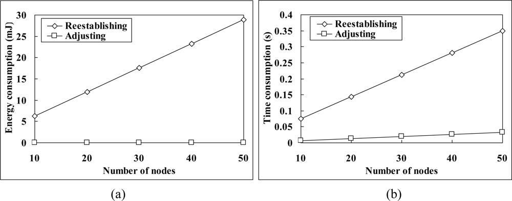 Figure 11 shows the energy and time saving brought by the proposed schedule adjustment mechanism (here we assume that the workload of every node in the network has been changed to make the energy and time consumption of the schedule adjustment mechanism maximized). The period of schedule reestablishment is relatively long, and all nodes have to be kept awake, thus causes extra high energy consumption. As a comparison, through our schedule adjusting, the adjustment messages are piggybacked in normal network control and data delivery packages, and as a result, each node almost does not need to spend additional energy on schedule adjustment, and this advantage can even be kept regardless of the network scale, as shown in Figure 11(a). At the same time, because the schedule adjustment is conducted in normal network control and data delivery operations, the overall time consumption of schedule adjustment is also much lower than that of schedule reestablishment, and increases much slower when the network scale grows, as shown in Figure 11(b).