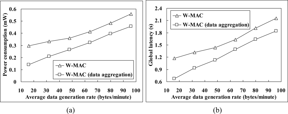 Data aggregation is wildly used in WSNs for reducing data traffic. In this part, we choose packing aggregation, a typical lossless data aggregation technique which packs several non-aggregated packets into one aggregated packet without compression, for evaluation. Figure 12 gives a comparison between the performance of W-MAC with and without data aggregation under different data generation rate conditions (The number of nodes is set to 50). When data aggregation is employed, the data aggregation rate R in the workload W will be reduced, thus W-MAC will shorten the active time of nodes, and then the power consumption and data delivery latency will be lower. The power consumption and global latency of W-MAC with data aggregation can even be reduced to a half of that without data aggregation under low data generation rate condition (16 bytes/minute).