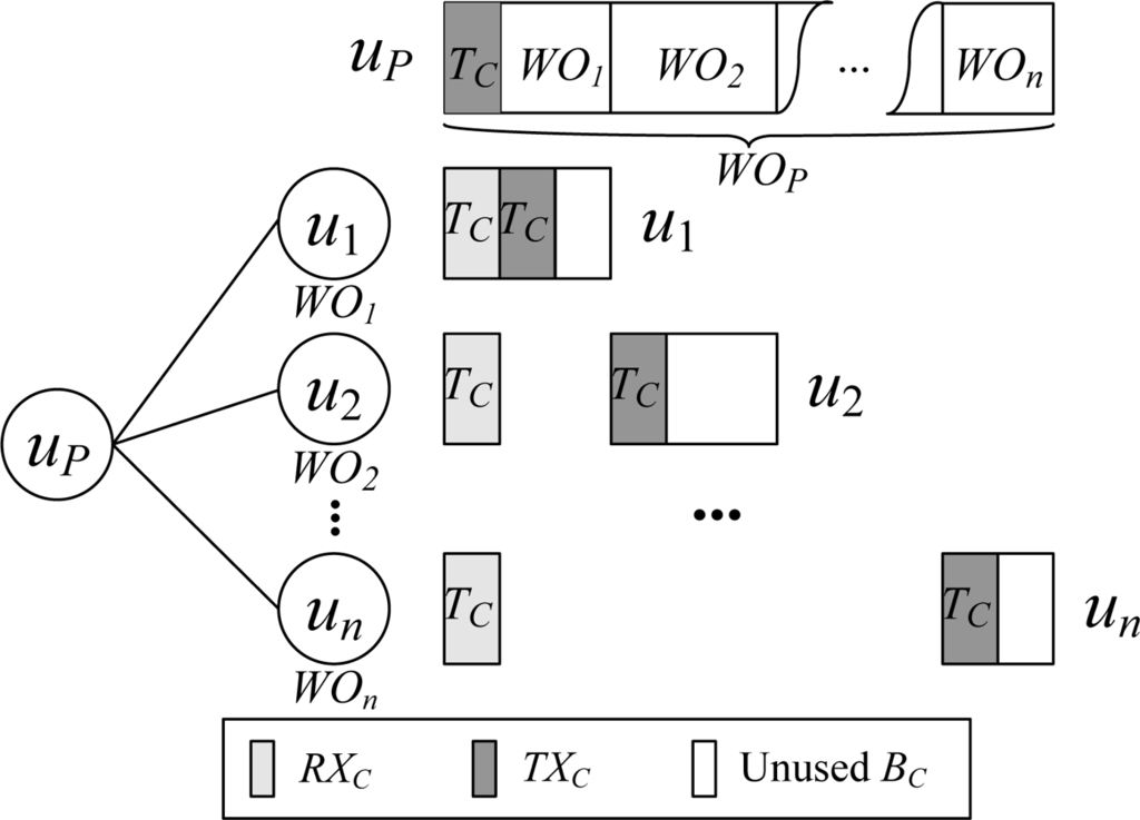 An example of the control interval scheduling process is shown in Figure 2. Let the number of children of the node uP be n, and the control workload of the child node uj (1 ≤ j ≤ n) be WOj. Then WOP is . In scheduling, TC amount of time at the beginning of the control time pool of the node uP is reserved for uP to transmit control packet, and the rest of the time is allocated to its children. It can be observed that the active time of a node in the control interval is a constant, and achieves the minimum value 2TC.