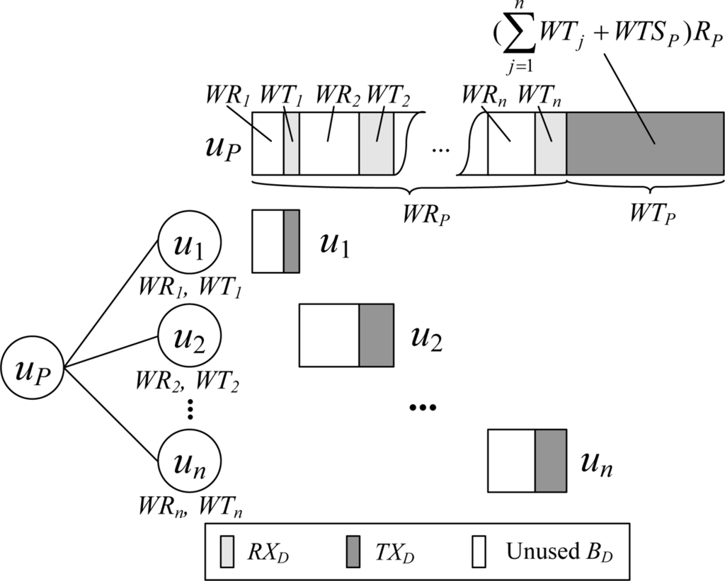 An example of the data interval scheduling process is shown in Figure 3. Let the number of children of the node uP be n, and the data workload of the child node uj (1 ≤ j ≤ n) be WRj and WTj. Then WRP is: