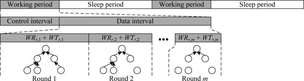 Because the subtree-based iterative cascading scheduling mechanism makes the node transmit data after receiving all data from children, the data aggregation scheme can achieve the highest accuracy and efficiency. However, as in LL-MAC, this attribute may lead to buffer overflow because sensor nodes are typically equipped with limited memory space. In order to alleviate this problem, we can break a single convergecast operation into multiple rounds, and in each round, we transmit only part of the data records. To support multi-rounds convergecast, we extend the data workload of the node ui to a m × 2 matrix ([WRi,1,WTi,1], [WRi,2,WTi,2],…[WRi,m,WTi,m]), where m indicates the number of rounds. Then, we will have m different schedules for one data interval according to the data workload of each round, and the data time pools of the sink node ur can be represented as:
