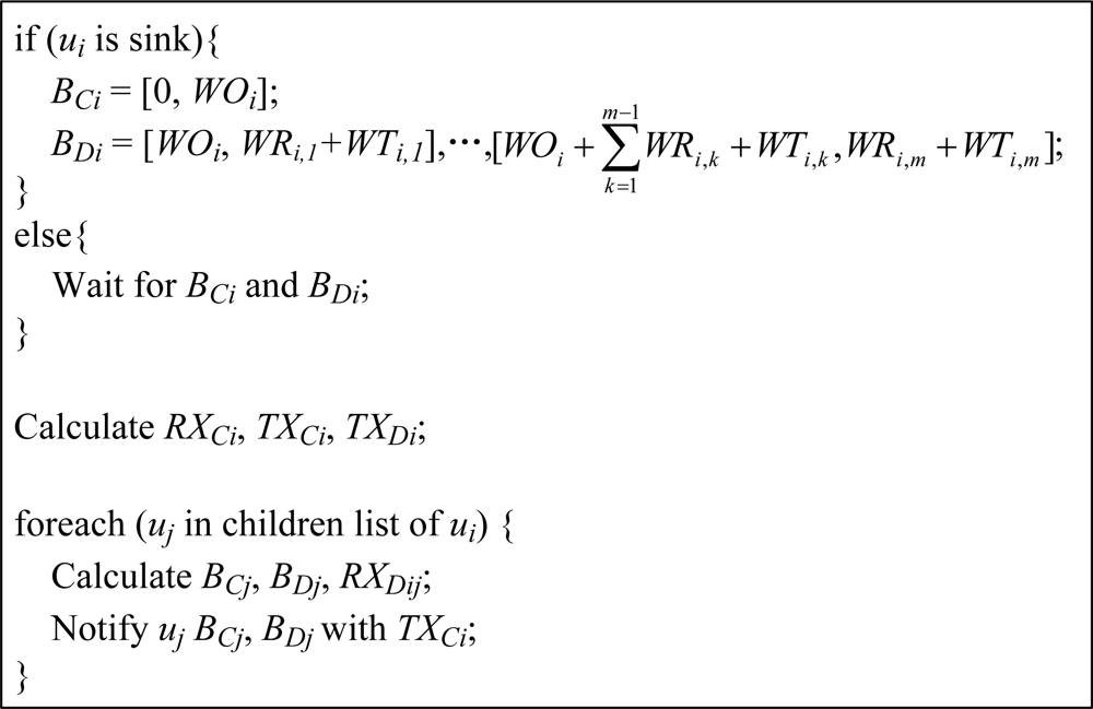 In Equation (11), Oi is the set of descendants of the node ui. K[Oi] is the cardinal of Oi. WTSmax is the length of the uniform slot assigned by LL-MAC, since the length of time slot in LL-MAC depends on the data generation rate of the node that generates the maximum amount of data.