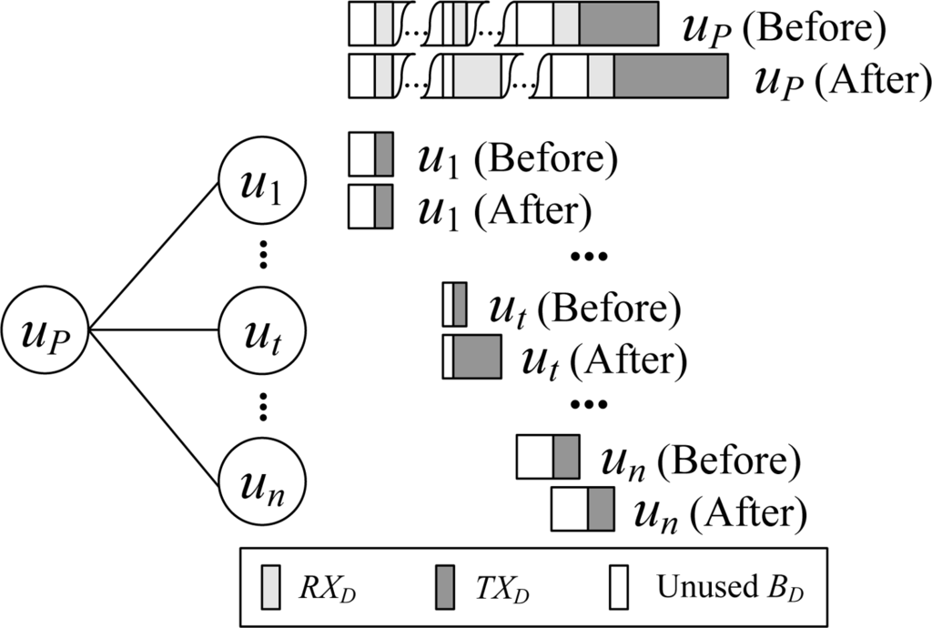 After getting all children’s data workloads, the parent can calculate the data time pool allocations for its children. For the node ui, the data time pool for the child node uj can be calculated using Equation (4), in which indicates the length of the kth node’s data time pool whose allocation is before the node ui: