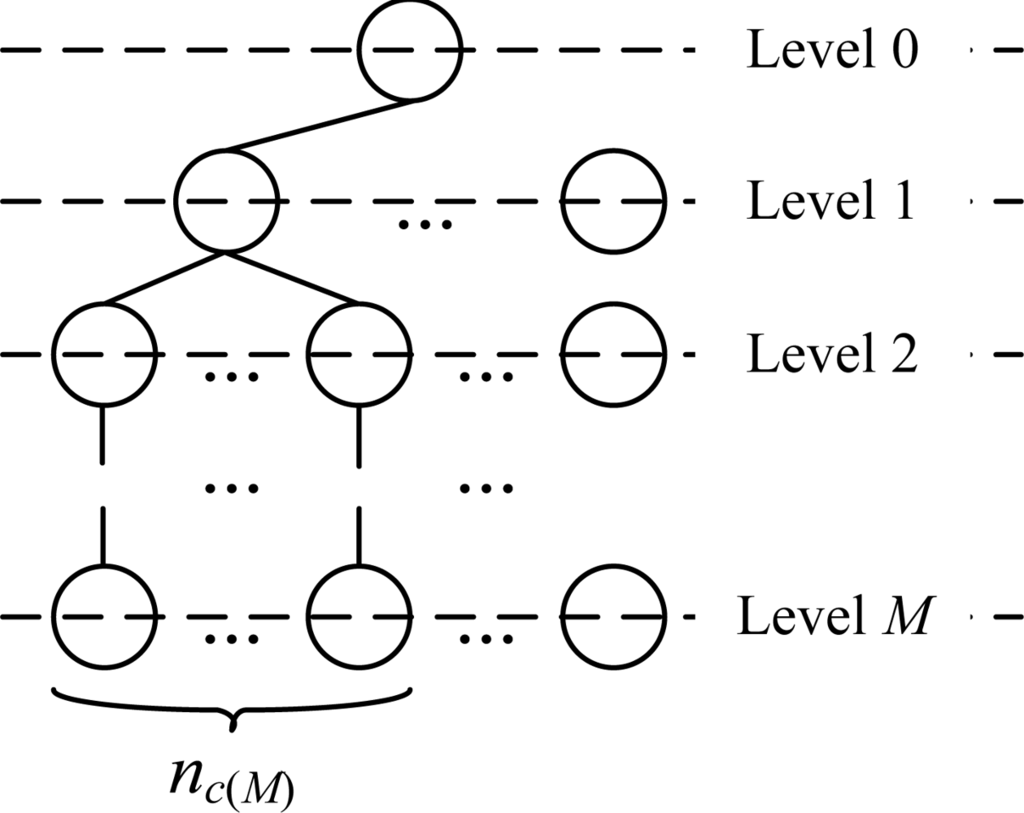 Given a general M-level data collection network (as shown in Figure 7), we select the node which is at the level M, and will be the first one to transmit data in the leftmost subtree, to calculate the end-to-end data transmission latency. We denote the selected node as uM0, the number of sensor nodes at the level m of the subtree which uM0 belongs to as nc(m), and the number of sensor nodes at the level m of the whole network as n(m).