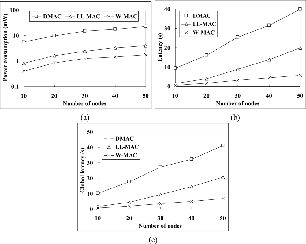 Figure 8(c) shows the simulation results of global latency. The average global latency of W-MAC is only 12% of that of DMAC, and 36% of that of LL-MAC. Besides those have been explained in the latency simulation results analysis, the relatively long control interval of LL-MAC also plays an important part in its high global latency. Figure 9(b) gives a comparison between the control interval length of LL-MAC and W-MAC. It can be observed that the control interval length of LL-MAC increases faster when the network scale increases.