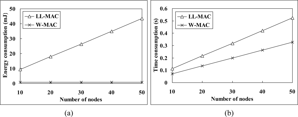 Figure 8(a) shows the power consumption simulation results. The average power consumption of W-MAC is only 8% of that of DMAC, and 48% of that of LL-MAC. The excessive power consumption of DMAC mainly comes from the fact that: (1) random backoff increases the length of slot. Meanwhile, the node has to wait for 5 slots before retrying when the channel is unavailable; (2) extra large data record must be divided into multiple segments to be transmitted in multiple slots. The power consumption of LL-MAC is higher than that of W-MAC due to: (1) relatively higher energy consumption in the control interval. Figure 9(a) gives a comparison between the energy consumption of LL-MAC and W-MAC in one control interval. It can be observed that the energy consumption of LL-MAC rises quickly when the scale of the network increases, but the energy consumption of W-MAC is independent of the scale of the network and always keeps at an extremely low level; (2) idle listening caused by uniform slots allocation.