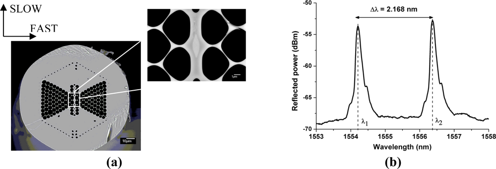 The function of the germanium doped fiber core is to allow using conventional ultraviolet fiber Bragg grating inscription methods. The FBGs were written with pulses of UV radiation originating from a Kr:F laser operating at 248 nm and with an interferometric Talbot system [17]. The writing of Bragg gratings in the germanium doped core of MOFs using this inscription technique has already been reported in [18]. The gratings are 5 mm in length with an averaged linewidth of 201 pm. The resulting Bragg spectrum shown in Figure 1(b) exhibits two clearly identified Bragg peaks. The peak separation is about 2 nm at λ = 1,550 nm which corresponds to a modal birefringence of about 2 × 10−3. This value is almost one order of magnitude larger than the values for conventional birefringent optical fibers, e.g., as reported in [19].
