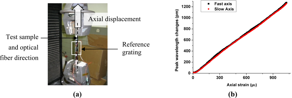 The samples were loaded in the axial direction corresponding to the integrated optical fiber direction and the wavelength changes were monitored at the same time. The axial strain applied to the samples is measured by a reference grating glued on top of the sample at the exact location of the Bragg grating of interest [Figure 6(a)]. A maximum strain of 1,000 μɛ is applied to the laminate at a rate of 200 μɛ/min.