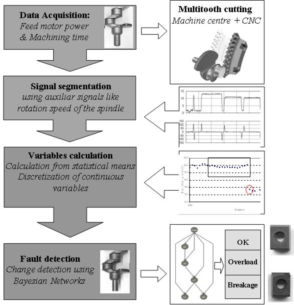 The virtual sensors developed in this work consist of a system for the data acquisition of internal CNC signals, a module for signal processing and an intelligent decision-making scheme. The approaches that can be found in the literature for this task are mainly spectral analysis [12–14], wavelet transforms [15,16], fuzzy logic [17–19], neural networks [20–22], time domain processing [14,23,24] and hybrid systems [25,26]. In this paper, the time domain processing approach is considered, where a segmentation of the electrical power consumption takes place before a Bayesian network (BN) analysis is done to identify faults. The only variable under consideration is the electrical power consumption of the tool, because under industrial conditions other kinds of physical variables, such as acoustics or vibration signals, are not easily measured or are too noisy [27]. This new virtual sensor, which is based on power consumption analysis and Bayesian Networks classification-task capabilities, can be applied to different kinds of cutting operations. The proposed solution has been successfully applied to multitooth tools in the car industry under real conditions. Further applications of this technology are to be found in the mass production of metal pieces, including aluminium ribs for planes, and vehicle and lorry crankshafts.