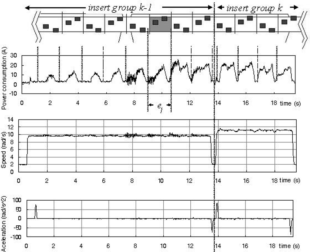 Among the different algorithms in use, those based solely on a priori assumptions (blind segmentation) or processing of the signal itself were shown to be ineffective. An auxiliary signal was therefore necessary to assure correct signal segmentation. The selected auxiliary signal was the tool’s speed. Figure 4 shows part of the machining cycle of the multitooth tool. The upper plot shows a partial drawing of the cutting tool that includes two insert groups and below the drawing, the electrical power consumption recorded by the data acquisition system of the virtual sensor. No pattern may be easily recognized with great certainty. A vertical line shows the change between two cutting insert groups. At the bottom, the tool’s acceleration and speed is plotted. Each insert group works at different tool speeds and a partial stop of the tool happens each time a new insert group moves into the cutting position. This pattern of acceleration peaks and different levels of constant speed may be used for signal segmentation.