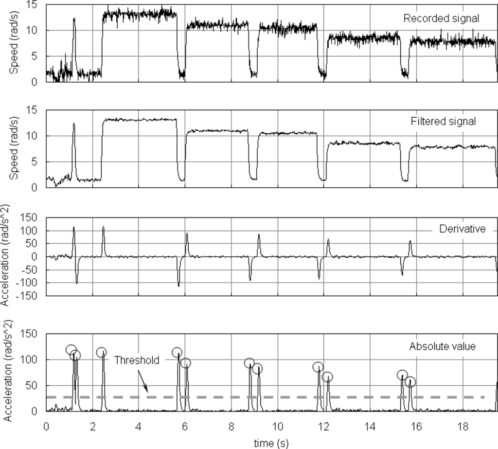 Once the recognition pattern strategy is defined, the speed signal should be processed before the identification of cutting insert groups can take place. First of all, a moving average type filter is selected to reduce background noise. This filter keeps the sharp variations in the signal from tool starts and stops. Secondly, angular acceleration is calculated. To achieve a robust derivative, the acceleration signal is obtained from the slope of a moving linear regression of the speed. This technique reduces the noise in constant speed areas and emphasizes the changes that occur between cutting inserts change, which results in an auxiliary signal that refers to power consumption segments. Subsequently, the maximum absolute value of angular acceleration is then detected by means of a second-order polynomial fit. It is necessary to avoid the processing of constant speed areas to speed up the detection process of the maximums. A threshold for angular acceleration was therefore defined, below which the algorithm does not consider that a maximum could occur. Figure 5 shows an example of the successive stages of processing the tool’s speed signal.