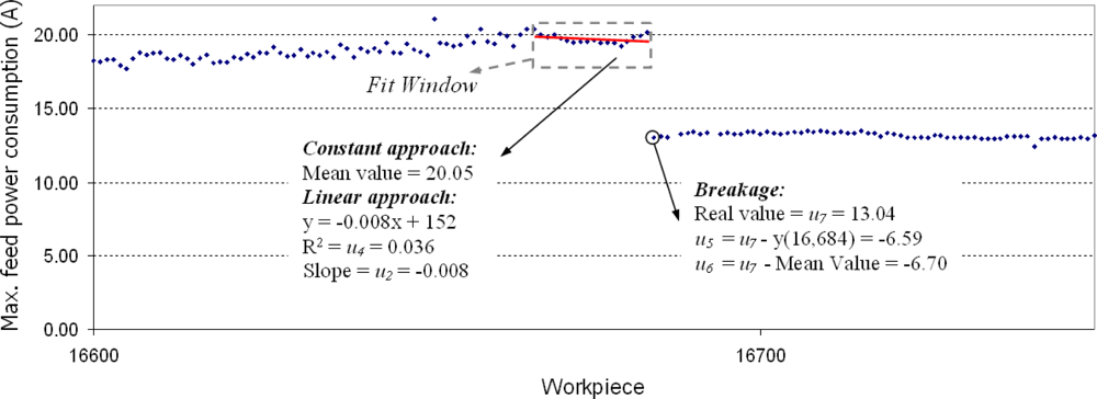 The maximum values are extracted from the signal segmentation of the electrical power consumption by the feed motor for each machined workpiece. From this value, 5 variables (described below) are calculated considering the behaviour of the tool in the 25 former pieces. Two assumptions may be made for this interval: either the feed power consumption evolution is almost negligible or the feed power consumption already shows a linear evolution. Both assumptions are considered in this work, to ensure that the virtual sensor is flexible, because different groups of inserts could behave in different ways. In the former case, the mean value of the power consumption of the former 25 workpieces is calculated. In the latter case, the power consumption linear fit of the former 25 workpieces and its correlation factor are calculated. Figure 6 shows both fits in one real case. The point under study is workpiece number 16,684, where a breakage occurs. The linear fit of the 25 former pieces predicts a feed power consumption of 19.63 A, and the mean value of the 25 former pieces is 19.74 A. In reality, however, a feed power consumption of 13.04 A occurs due to insert breakage. Figure 6 shows the Fit window, the linear fit and its main variables (slope and correlation factor), but also the change between real power consumption and expected power consumption for both approaches.