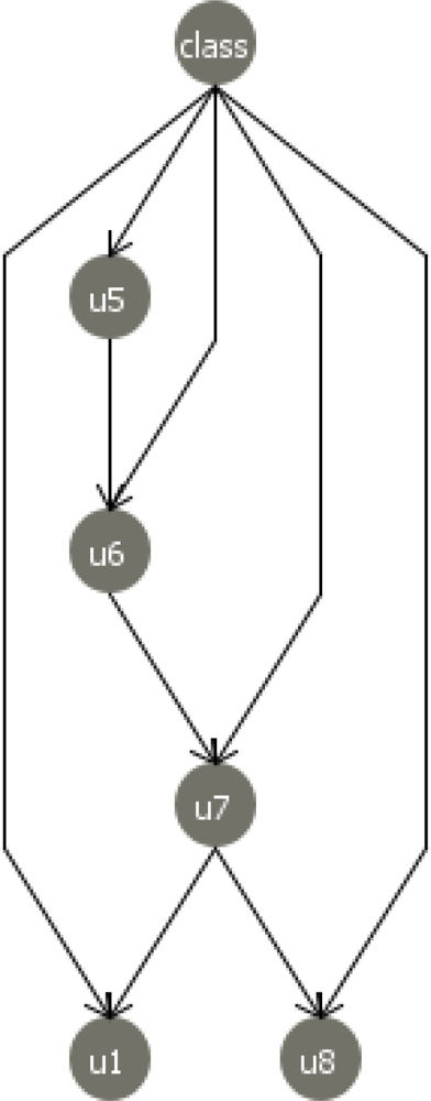 Before building the network of the Bayesian classifier a feature subset selection was performed to discard irrelevant variables. The goodness of a subset of variables was assessed by using a filter approach, i.e., ranking the variables in terms of some scoring metric usually based on intrinsic characteristics of the data computed from simple statistics on their empirical distribution. Here, information gain is selected with regard to class variables as the scoring metric to evaluate the value of a variable. Information gain I(class X) is the difference between the entropy of class and the conditional entropy of class given X for any variable X. Weka [46] software, a free suite of machine learning software written in Java, developed at the University of Waikato (New Zealand), was used for this network learning process. Different structures were tested to build the BN structure that achieves the highest breakage detection rate. The best structure was identified when only 5 variables were selected: u5, u6, u7, u1 and u8. The accuracy of this network was 98% compared, for example, with the figure of 97% for the network that incorporates all 8 variables.