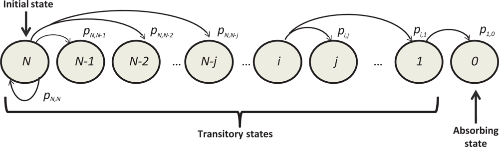 The state of an identification process in a static and a mixed scenario is determined by the number of remaining unidentified tags. Thus, the identification process can be modeled as a homogeneous DTMC, Xs, where each state of the chain represents the number of unidentified tags, being s the frame number. Thus, the state space of the Markov process is {N, N − 1, . . . , 0}, being N the number of tags to identify. Figure 1 shows a partial DTMC state diagram from the initial state, X0 = N. The transitions between states is governed by the probability of identifying a certain quantity of tags t in a given frame or, in other words, the probability of going from state i to an state with (i − t) tags still unidentified. Let us remark again that we are considering the number of tags identified in a frame so a maximum of t = K tags can be identified in a frame.