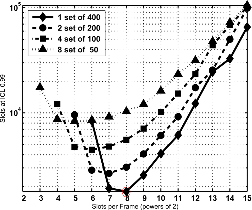 From the former equation the CDF of T is extracted and the minimum sojourn time is directly determined with the same procedure as Section 3.2. The minimum sojourn time has been evaluated for different subset sizes and τ settings. Figures 8, 9 and 10 show the results for N = 400 tags, J = 1, 2, 3 and 4, τ = 0, 100, and 1,000 slots, ICL = 0.99, and different frame lengths K = 2x, being x ∈ [3, 4. . . , 15]. As can be seen, in both figures there is an optimal configuration for each value of the frame length K, and a global optimum for a particular K. In particular, Figure 9 shows that this global optimum is achieved with x = 5 (i.e., K = 32), and 8 subsets of 50 tags. For larger values of the overhead τ, as in Figure 10, using a single set becomes a better option.