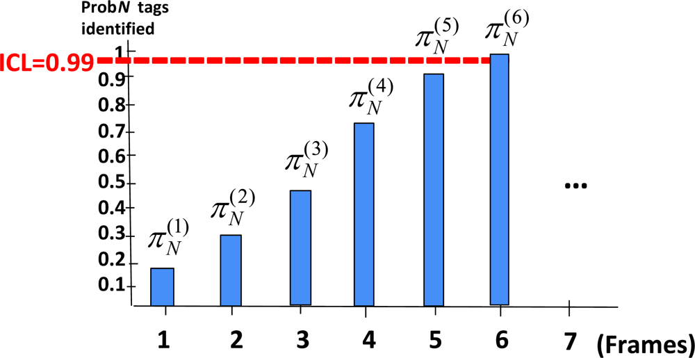 Figure 3 illustrates this method for ICL set to 0.99. The s-th column represents the probability of having identified the whole set of N tags at end of frame s, that is . In this example, after six frames, the probability of identifying all tags is higher than the ICL selected. That is, each group of tags should remain in coverage for at least 6 identification frames in order to guarantee that, in the 99% of the cases, all tags are successfully identified. Let us remark that this is not the same as guaranteeing that 99% of tags are successfully identified in each group, being the former condition stronger that the latter one.