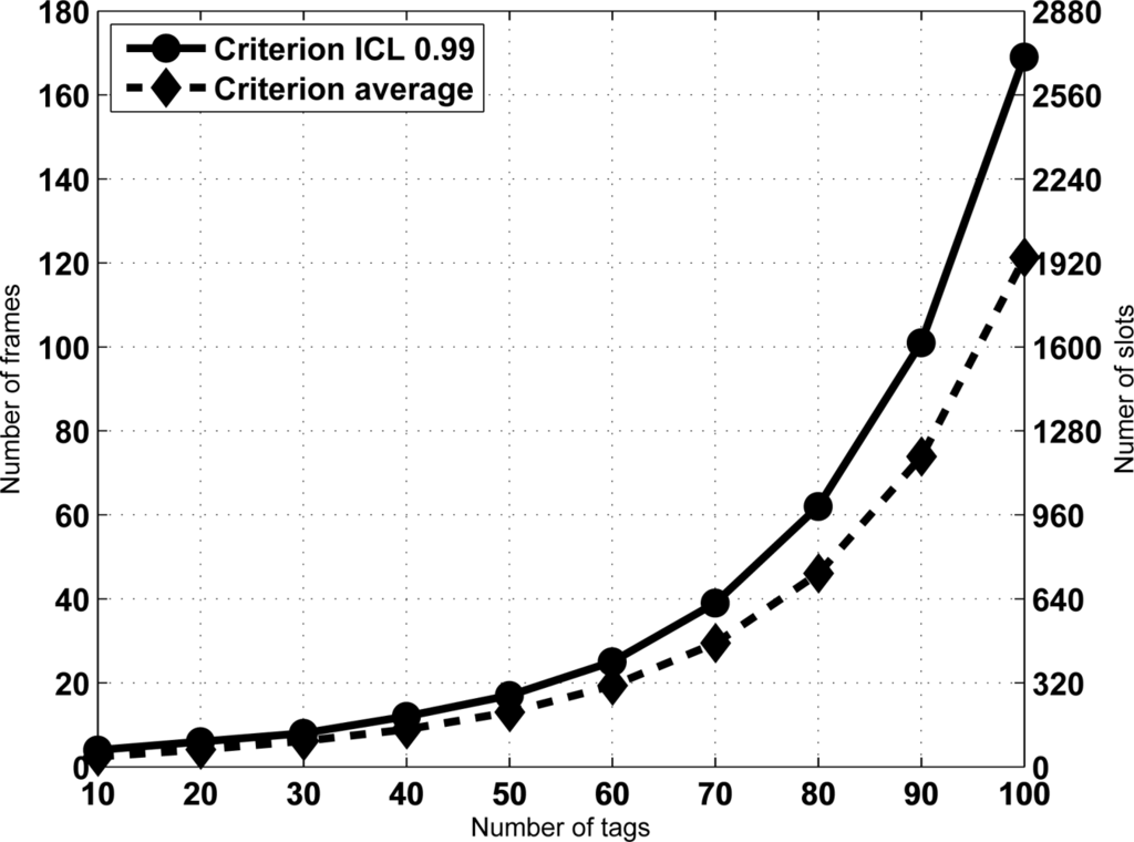 Clearly, the average number of lost tags grows as the population increases if the sojourn time is the average identification time. Moreover, the average number of lost tags with the criterion of ICL level set to 0.99 is almost negligible. Result trends are similar regardless of the frame length K, and for larger tag sets.