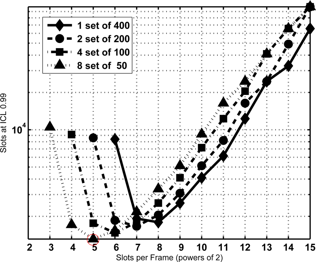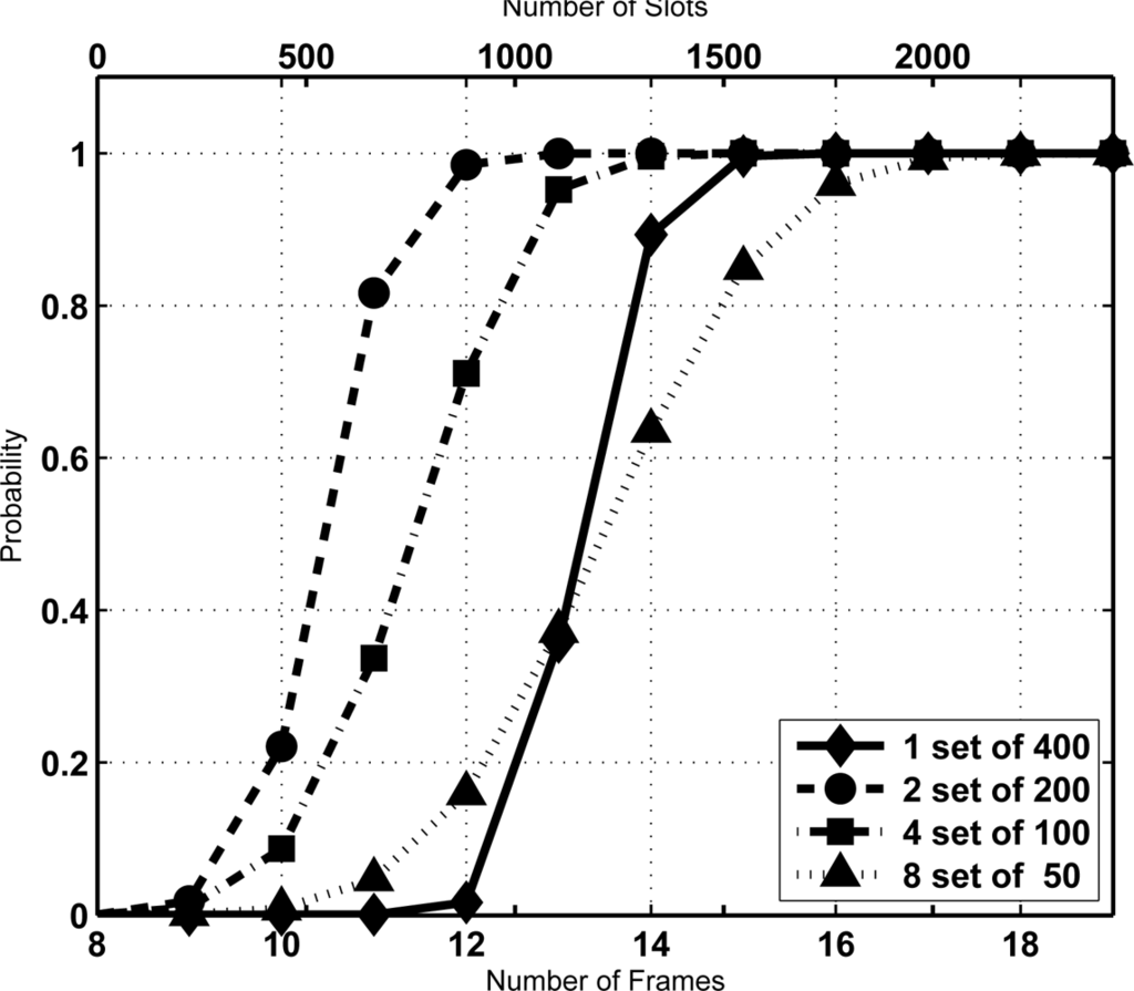 For mixed scenarios where the tags only remain in coverage for a certain sojourn time the goal must be different. In this case, the probability that some tag lost in a group must be minimized. As stated in the introduction, configuration must be established to ensure with a given Identification Confidence Level (ICL) that all the tags in a set have been identified before leaving the reading area. Given an ICL level the minimum required sojourn time can be derived from the cumulative distribution function of the reading time, which is computed in the next sections.