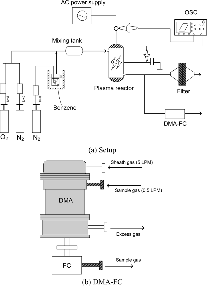 Figure 1 shows the experimental setup (a) and the DMA (differential mobility analyzer; Wyckoff Co., Ltd.) equipped with a Faraday cup (FC) for the aerosol measurement. Since the size range was found to below 100 nm in the previous study [19], the DMA was optimized to measure aerosols smaller than 100 nm. The experimental setup consisted of the plasma reactor, power supply, oscilloscope, and gas cylinders. A cylindrical surface discharge plasma reactor was used in this study. The inner diameter and effective length of the quartz tube were 15 mm and 200 mm, respectively. A coil-type electrode (0.45 mm diameter) was set at the inner surface of the quartz tube, which served as a high-voltage electrode. Silver paste was painted on the outer surface of the reactor as a ground electrode. The plasma reactor was energized with AC high-voltage. The input signal from the function generator (Tektronix, AFG 310) was amplified 2000-fold by a Trek 20/20B amplifier, and then applied to the plasma reactor. The charge Q was measured with a capacitor of 1μF connected in series to the grounded line of the plasma reactors. The discharge power (W) dissipated in the plasma reactor was measured by V-Q Lissajous figure method. Specific input energy (SIE), discharge power (W) transferred to the unit gas flow rate (liters per min; LPM), is calculated from the following equation: