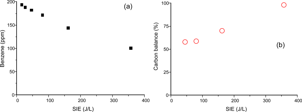 Gas-phase benzene was fed into the plasma reactor and its conversion rate and byproducts were measured using the on-line FTIR spectrometer. Figure 2 shows the conversion of benzene (a) and the carbon balance as a function of SIE (b). Gas-phase products determined from the FTIR spectrometer were CO2, CO and HCOOH (formic acid). Based on the quantitative FTIR measurement, carbon balance was calculated from the following equation: