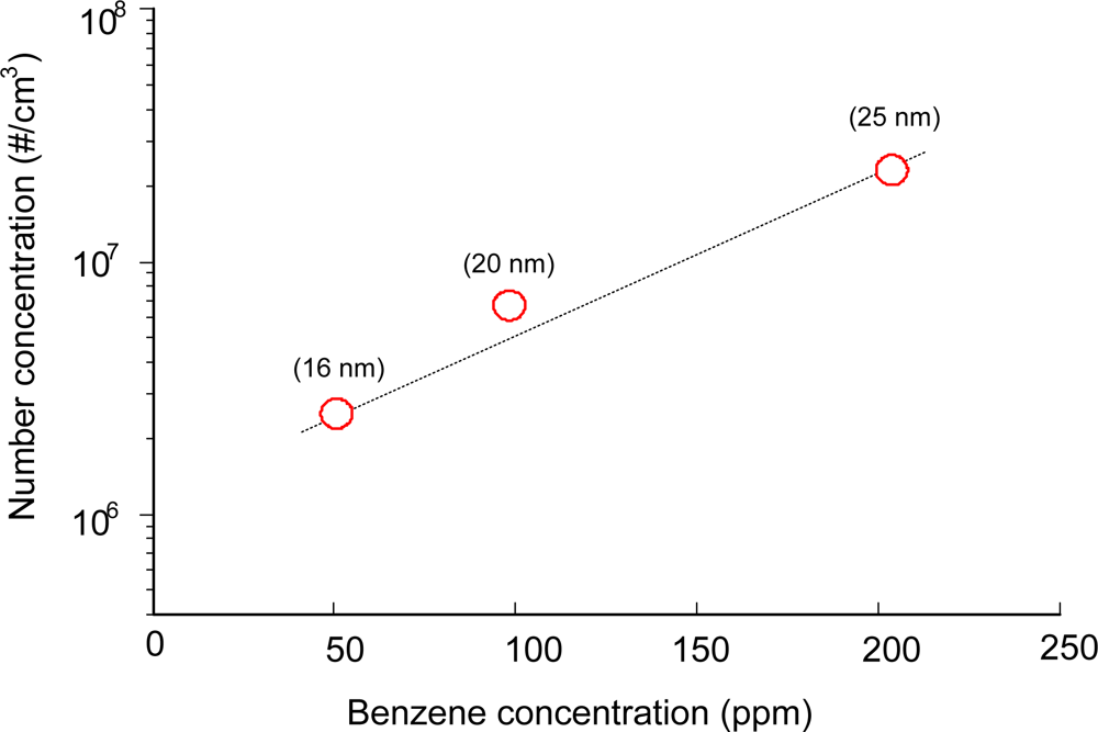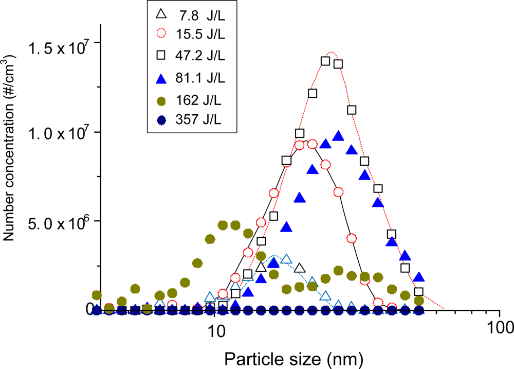 The missing parts in carbon balance are often found as solid products (including aerosols) on the reactor wall or on the tubing. Figure 3 shows the size distribution of the aerosol according to the energy input to the plasma reactor. It should be noted that aerosol formation did not occur in the absence of benzene in this study. The formation of solid products in benzene-N2 mixtures was so rapid that the stable operation of the reaction was hampered with time. For this reason, aerosol measurements with DMA-FC were only done for air mixtures. Aerosol formation was detected even at low SIE of 7.8 J/L. The peak size and number concentration kept increasing up to 47.2 J/L, and reached 25 nm and 1.4 × 107 particles/cm3, respectively. When the SIE was increased to 81.1 J/L the number concentration decreased by about 30% without changing the size distribution. These growth and decay characteristics of aerosols with SIE can be explained by the branching of chemical reaction. At low SIE range below about 50 J/L, formation and growth of aerosol are occurring dominantly. On the other hand, the produced aerosols may further undergo oxidation that dominates at SIE values higher than about 50 J/L. The unimodal distribution changed to a bimodal distribution at 162 J/L. Aerosols completely disappeared at 357 J/L, which is consistent with the carbon balance data in Figure 2(b). This observation also indicates that the aerosols are composed mostly of organic compounds.