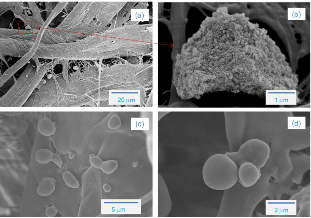 Figure 5 shows FE-SEM photos of the aerosol collected downstream of the plasma reactor. In the case of air mixtures, the size of aerosols (a) collected on the filter was in the 0.5–2.0 μm range. The FE-SEM photo with further magnification, (b) ×20,000, clearly indicated that the each particle is a collection of nanometer-sized aerosols, which is consistent with the DMA measurement. Under nitrogen conditions, deposition of solid products with dark-brown colors can be observed near the outlet of plasma reactor, even with the naked eye. The FE-SEM photos indicated that the aerosols formed in a N2 environment had smooth surfaces and irregular size (1–5 μm). In an early review by Fomin it was indicated that the reaction of benzene with active nitrogen produced nitrogen-containing polymers [23].