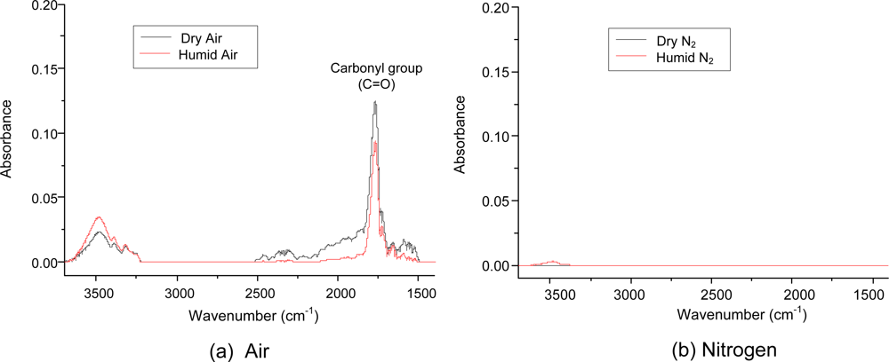 The chemical composition of the aerosol was measured with the DRIFT spectrometer, and the data are shown in Figure 6. To avoid water adsorption on the filter, a PTFE membrane filter used in aerosol sampling for the DRIFT measurements. Under air conditions, water vapor did not influence the DRIFT spectrum. The most prominent absorption band was at 1,650–1,800 cm−1, which was assigned to a carbonyl group (C=O) [24]. It should be noted that the carbonyl group peak did not appear under nitrogen conditions. This observation supports that the oxygen plays more dominant role than the water vapor in the formation of C=O groups. The large absorption of the carbonyl group also provided firm evidence that the ring cleavage products dominated in the aerosol. The broad spectral band of 3,200–3,700 cm−1 was assigned to water molecules on the surface (stretching vibrations of hydroxyl groups) [25]. This peak was not observed in dry nitrogen. The C=C bond in the aromatic ring (1,550 cm−1) was not observed under any tested conditions. This result indicates that the ring-cleavage products are the major compounds of the aerosols.
