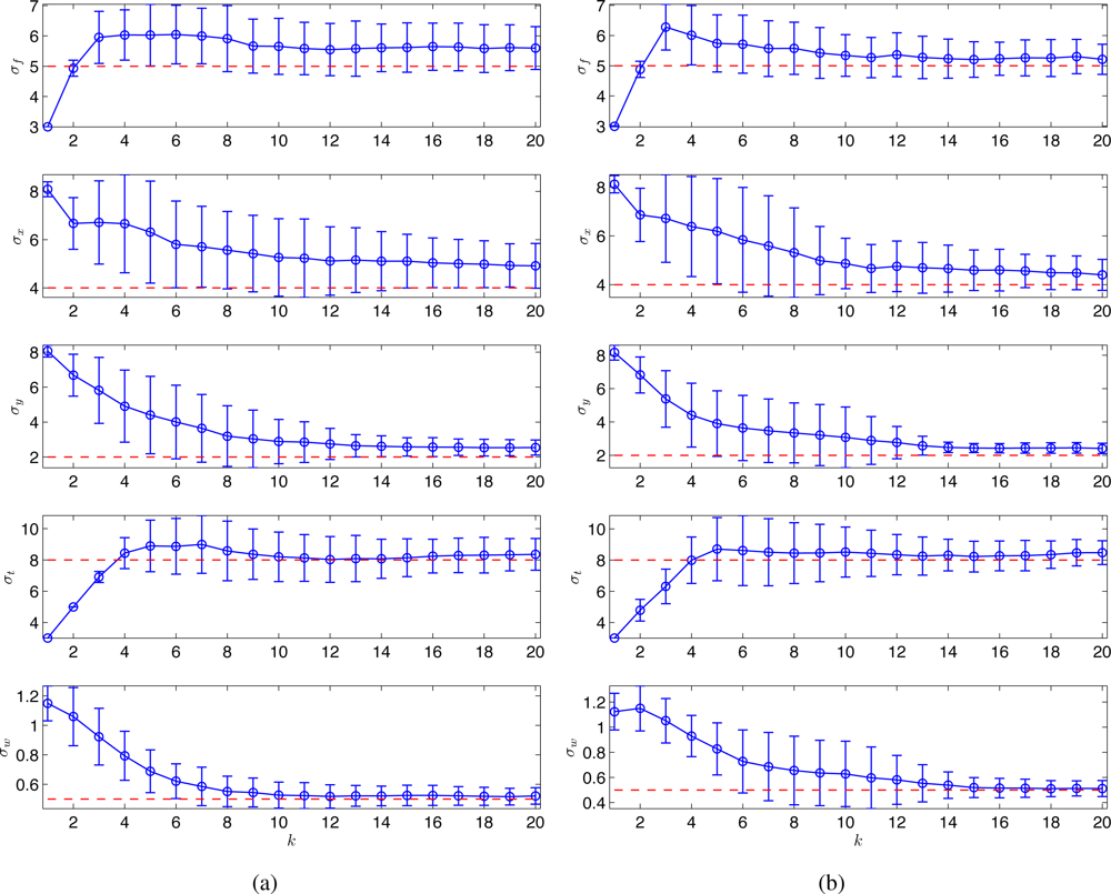 Monte Carlo simulations were run for 100 times, and Figure 6 shows the estimated σx, σy, and σt with (a) the random sampling strategy and (b) the optimal sampling strategy, respectively. With 100 observations, the running time at each time step is around 20s using Matlab, R2008a (MathWorks) in a PC (2.4 GHz Dual-Core Processor). No attempt has been made to optimize the code. As can be seen in Figure 6, the estimates of the hyperparameters tend to converge to similar values for both strategies. Clearly, the proposed strategy outperforms the random sampling strategy in terms of the estimation error variance.