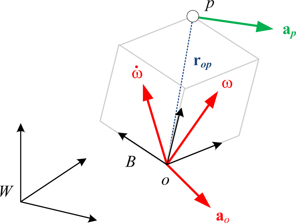 A brief review regarding construction of the 12-axis IMU is described in this section []. As shown in Figure 1, the acceleration vector, ap, of a point, p, rigidly attached to an accelerating body frame B with origin o, in the inertial frame, W, is a function of the body’s angular velocity, ω, angular acceleration, ω̇, and translational acceleration of the body origin, ao, represented by: