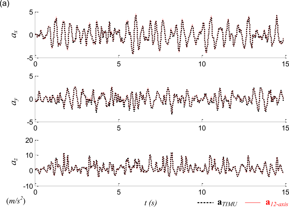 Inertial sensors have been widely used in various applications, including motion detection [], body state estimation [–], navigation [–], microsurgery [], rehabilitation [], etc. Traditionally a standard inertial measurement unit (IMU) comprised of 3-axis linear acceleration measurement by accelerometers installed at center of mass (COM) and 3-axis angular velocity measurement by rate gyros readily provides complete six degree-of-freedom (DOF) motion-related measurements spanning the 3-dimensional space. For highly dynamic systems which favorably have angular acceleration measurements, to the best of our knowledge there is no off-the-shelf product available. One widely adopted approach to derive this state is by differentiation of rate gyro signals, together with the filter technique. The other approach is based on the principle of Newtonian Mechanics, which relates linear acceleration, angular acceleration, and angular velocity in a memoryless manner. Because of this characteristic, derivation of the angular acceleration by only the inertial sensors seems to be a feasible method [].