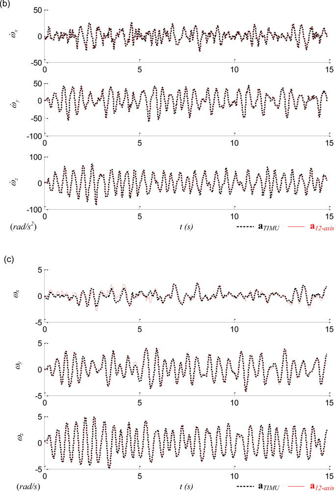 In the experimental evaluation the apparatus was moved arbitrarily in the 3-dimensional space; thus the linear and angular accelerations along all three principal axes could be induced in the test. Before the sensor readings were imported into Equation (5), the raw accelerometer readings were filtered by Chebyshev filters and gravity-compensated by the readings of the 2-axis inclinometer. Table 1 lists the statistical summary of the experiments where the RMSEs were the comparisons between the estimated state of ω12-Axis and the measured state from the traditional IMU installed at the COM, ωTIMU. The angular acceleration of the traditional IMU is obtained by differentiation of the angular velocity, followed by filtered with a Chebyshev filter. Figure 10 plots one typical result of the experiment. Figure 10(a) confirms that though the sensors of the proposed 12-axis GF-IMU (thin red solid lines) are not located at the COM, they can indeed recover the COM linear acceleration. Figure 10(b) shows that the angular acceleration can also be correctly derived by the 12-axis GF-IMU. Figure 10(c) reveals that though several unmatched sections exist between the 12-axis GF-IMU and the traditional IMU readings, the proposed algorithm in general can indeed recover the angular velocity along with all three principal directions. The discrepancy either resulted from (i) the accumulated integration error where the magnitude of the quadratic sums fell into the integration model for too long or (ii) the incorrect selection of the angular velocity in the quadratic model.