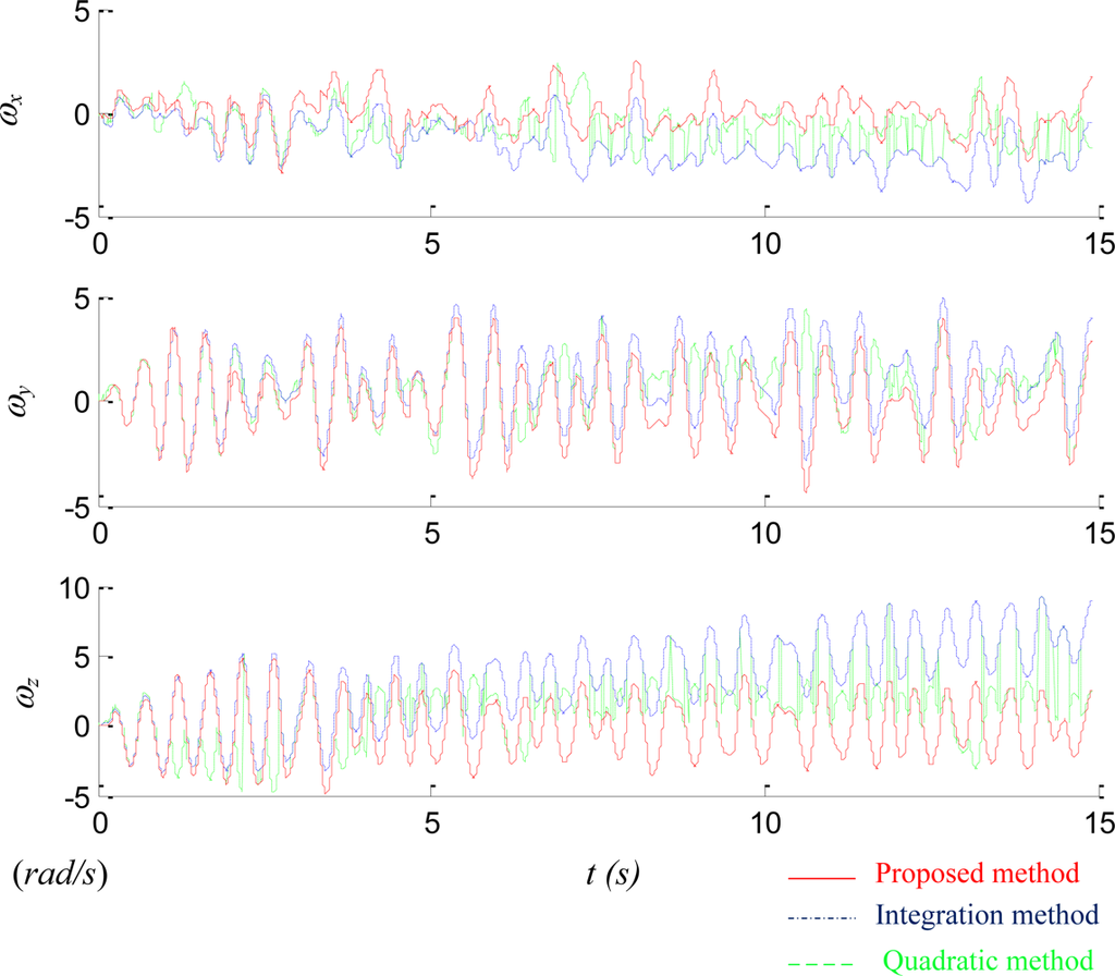 The angular velocity derived from its quadratic form (hereafter referred to as the “quadratic method”) has non-drift nature; however, the trade-off is the sign ambiguity problem, meaning to select the correct answer from multiple potential choices resulted from “square-root” computations. More specifically, assuming the first three quadratic terms shown in Equation (3) are chosen:
