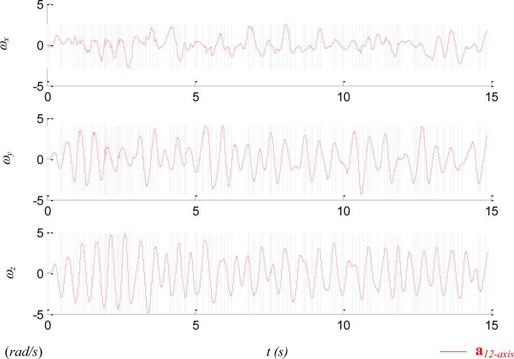 Besides the four cases shown above, there are nineteen combinations left undetermined. Because there is no clear trend to judge the adequateness of the quadratic method in these combinations, the estimated angular velocity ω12-axis is derived from the integration method (i.e., ω12-axis = ωint). If the computed a, b, or c appears in an unreasonable less-than-zero value due to empirical computation error, the estimated angular velocity ω12-axis is also derived from the integration method (i.e., ω12-axis = ωint, the quadratic sums are not utilized in the computation in this time stamp).