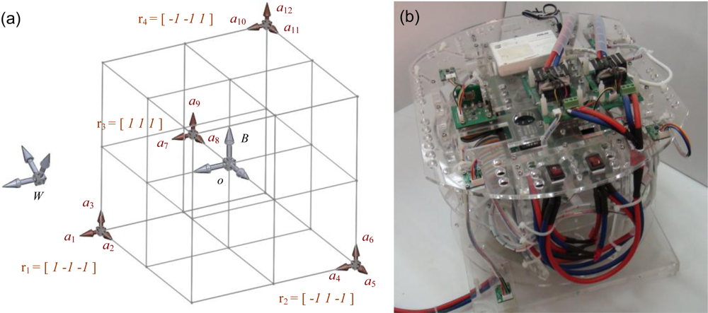 The gyroscope-free inertial measurement unit (GF-IMU) [–] is one of the more popular IMU methods to achieve this goal. Compared to the traditional IMU, the GF-IMU utilizing only accelerometers includes several features such as low-cost, easy calibration, being less affected by temperature variations, and a simple mechatronic setup. In general, the GF-IMU is capable of deriving linear acceleration, angular acceleration, and angular velocity. Because the latter two states have integrative/derivative relation, a GF-IMU comprised of 6-axis measurements is theoretically capable of yielding all three states (i.e., 9 scalar unknowns). One of the typical configurations of sensors is to have a 3-axis acceleration measurement at the COM and three 1-axis measurements on the principal axes. However, the iterative computation between the derived angular acceleration and the integrated angular velocity can possibly deteriorate the fidelity of these two states. Padgaonkar et al. proposed a 9-axis acceleration measurement system capable of deriving bounded linear and angular acceleration []. Chen et al. proposed a novel 6-axis system which yielded a bounded angular acceleration []. The system was carefully evaluated [] and improved by adding a 3-axis acceleration measurement []. In general, due to the quadratic formulation of angular velocity in the rigid body dynamics, the derivation of this state in the 9-axis IMU faces the sign ambiguity problem []. This dilemma can be solved by comparing it to the estimated angular velocity which is integrated from the angular acceleration measurement [] or by adding the redundant measurements to the IMU, for example, to increase the measurements to 12-axis []. Parsa et al. later developed an original all-accelerometer IMU which requires twelve 1-axis accelerometers mounted at specific locations on the surfaces of a cube. The system is capable of deriving all three states in which the angular velocity was derived through an optimization procedure from six measured inputs in the quadratic form []. Schopp et al. reported another novel 12-axis IMU which was constructed by twelve 1-axis accelerometers in different configurations and utilized an Unscented Kalman Filter (UKF) to yield all three states simultaneously [].