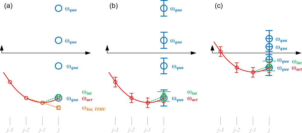 Practically, the quadratic method described above is likely to select an incorrect answer while the magnitude of the actual angular velocity, ωact, is small. If the derived ωj−1 at time stamp j − 1 is precise, the most likely cause of estimation error of ωj at time stamp j “in the perfect world” is the process of trapezoid integration, which assumes the acceleration is constant during that time interval. As depicted in Figure 3(a), the actual motion pattern may vary in a very fast manner, and the angular acceleration derived from the 12-axis GF-IMU catches the instant value at the sampled time stamp because of the memoryless computation shown in Equation (7). The discrepancy between the instant and average accelerations during time stamp j results in the estimation error of the initial-guess, ωint,j. This phenomenon in the traditional IMU (TIMU) which derives the angular acceleration by the differentiation of the angular velocity signal is even worse since the differentiation process introduces the noise and delay as shown in Figure 3(a). In the empirical world the situation is even more severe due to signal noises and accumulated digitization round-off errors during computation. For example, the estimated ωj−1 at the j − 1 time stamp may already have certain estimation error, and the calculated angular acceleration and quadratic angular velocity shown in Equation (7) also have certain errors due to digitized matrix inversion and noisy sensor signals as depicted in Figure 3(b). Both empirical effects strongly affect the accuracy of 1-out-of-8 selection process, especially when the magnitude of the actual angular velocity ωact is small, as depicted in Figure 3(c) where multiple choices of ωqua may fall into the estimated ranges. In addition, because the estimation process is iterative, one incorrect estimate may badly affect the correctness of future estimates. Therefore it can be concluded that the quadratic method is suitable while the magnitude of quadratic sums, a, b, and c, are either very close to zero or large (i.e., not small).