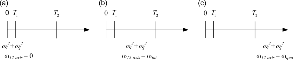The development shown in the previous sub-section indicates that the quadratic method is effective while the magnitude of the angular velocity is either close to zero or very large. Therefore, two thresholds, T1 and T2, are selected as the contexts. T1 is the boundary where the estimated angular velocity should be treated as zero, and T2 is the boundary where the quadratic method is effective. These two contexts divide the range of quadratic sums, a, b, and c, into three sections as depicted in Figure 4. While 0 ≤ ωi2 + ωj2 ≤ T1 as shown in Figure 4(a), referred to as the zero model, one can set the angular velocity to zero. While ωi2 + ωj2 ≥ T2 as shown in Figure 4(c), referred to as the quadratic model, one can obtain the angular velocity by the quadratic method. While T1 ≤ ωi2 + ωj2 ≤ T2 as shown in Figure 4(b), referred to as the integration model, one adopts the integration method.