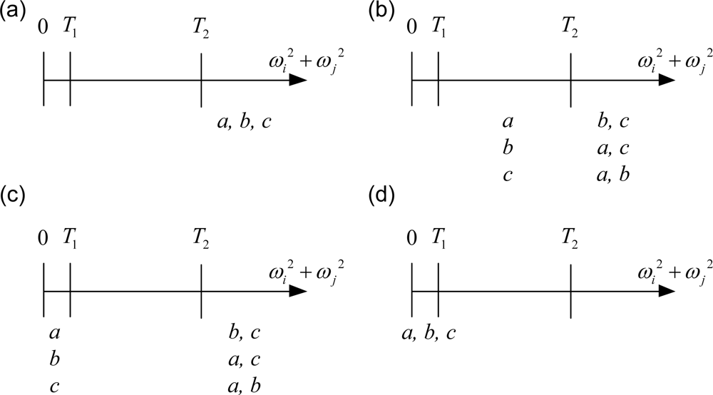 Similarly, both T1 ≤ b < T2, a, c ≥ T2 and T1 ≤ c < T2, a, b ≥ T2 are within this case.