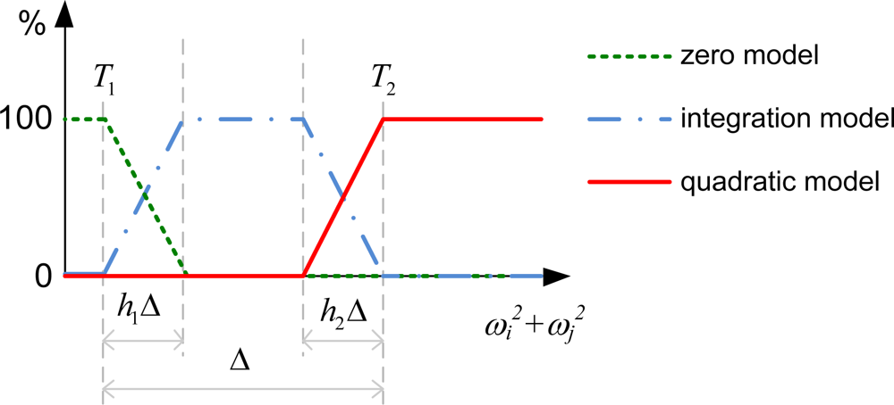 The proposed estimation shown in the previous paragraph has the “hard switching” nature. This implies an unreasonable situation because the trustworthiness of the models has a sharp boundary. Technically, suddenly switching the estimation from one method to another also introduces a signal discontinuity problem. Therefore the “soft switching” technique is adopted, which defines the probability of each model in a continuous manner as shown in Figure 6. When ωi2 + ωj2 is close to T1, ω12-axis is designed to be the linear combination of zero and ωint :