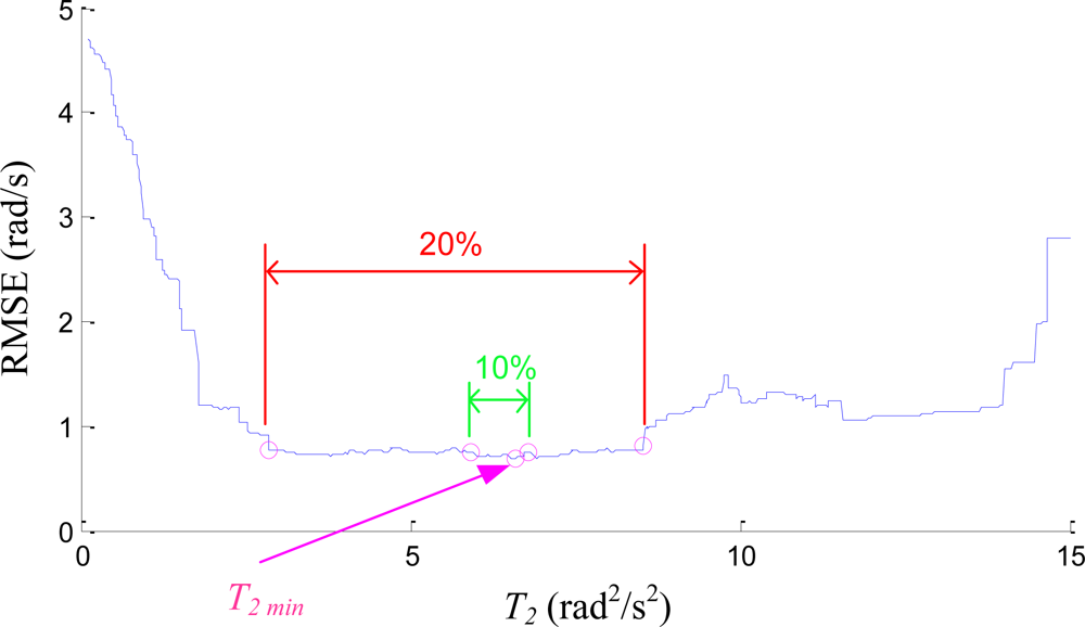 Figure 7 plots the typical Root-mean-squared Error (RMSE) vs. T2 based on one of the experimental data, where the RMSE is the comparison between the estimated angular velocity, ω12-Axis, and that measured by the traditional IMU, ωTIMU. The RMSE shown in the plot is the summed result of its three scalar components. The plot indicates that the RMSE is relatively large when T2 is small, when the quadratic method is over trusted. It also indicates that RMSE is relatively large when T2 is large. In this setting most of the estimates were done by the integration method and the data drift was observed. The wide and flat bottom of the curve shown in Figure 7 is also observed in other data sets, which indicates that there exists a wide selectable range of T2 values which yields similar performance, as the best RMSE happened at T2 min. For example, if the acceptable RMSE is bounded by an extra 20% of the best RMSE, the selectable range of T2 is spanned from 3 to 9.