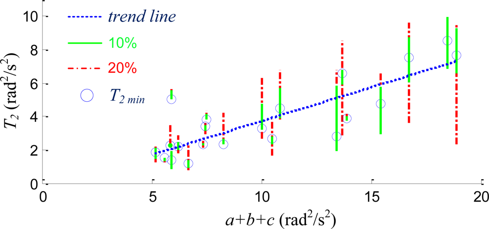 Figure 8 plots the variation of T2 min (blue circle) vs. the average level of the motion, which is quantitatively defined as the summation of the quadratic sums, a + b + c. Instead of defining the level of motion directly in the angular velocity, quadratic sums are utilized since these sums are available right after the multiplication of the inversed matrix to the sensory inputs shown in Equation (7). Because the errors resulted from the matrix inversion and noises due to empirical sensor readings are usually scaled with the magnitude of the signals, the selected T2 should increase as the magnitude of motion increases. The blue linear trend line with positive slope also confirms this phenomenon. The plot also reveals that the tolerable 10% or 20% increase of RMSE intersects with the linear trend line. Because the lengths of 20% lines are large and the slope of the trend line is small, the computation error of a + b + c has very little effect on the quantitative measure of the trend line. Thus the adequate T2 can be easily obtained according to the equation of the trend line when the quadratic sums, a, b, and c, are given. This plot suggests that the selection of T2 can be achieved by the given quadratic sums and the trend line, and the RMSE comparison test which requires the gyroscope input shown in Figure 7 is not necessary. The selected T2 is fixed for the followed real-time estimation.