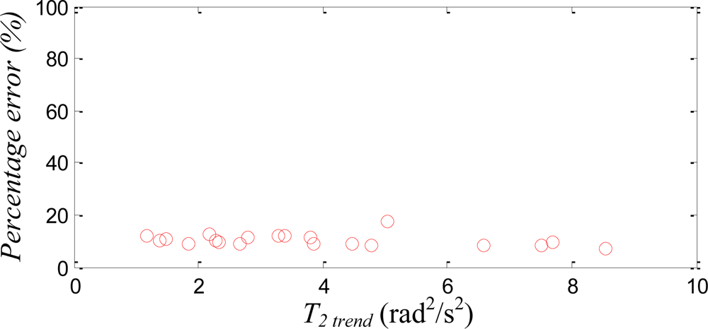 In order to quantitatively evaluate the usability of the trend line, instead of using T2 min as the context, Figure 9 plots the percentage error of the estimated angular velocity versus T2 trend, which is the selected T2 calculated from the trend line with given quadratic sums. Percentage error is calculated as the ratio of the RMSE to the maximum magnitude at that experiment trial, where the RMSE is the comparison between the estimated angular velocity, ω12-Axis, and that measured by the traditional IMU, ωTIMU. Figure 9 indicates that the computed T2 from trend line performs adequately; the percentage errors are mostly around 12% or less.