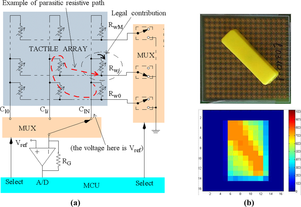 The local electronics for a tactile array of N columns and M rows based on a microcontroller PIC18F4680 (Microchip) are shown at Figure 2(a). These electronics are in charge of scanning the array, storing the data and sending it via CAN bus to a central processing unit. The latter has been a personal computer with a card to communicate with CANOpen for the results of this paper. This figure also illustrates the grounding strategy used to cancel crosstalk. Note that there is one operational amplifier per column in Figure 2(a). Their purpose is to set the voltage Vref at the tracks of all columns. Since the voltage of all rows that do not contribute to the output is also set to Vref, any possible parasitic path is short circuited. The output voltage of a column is given by: